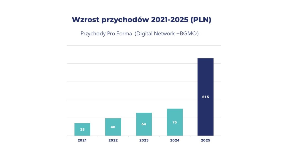 Kilka dni wcześniej Digital Network opublikował wstępne dane finansowe za 2025 rok. Skonsolidowane przychody wzrosły o 51% r/r, osiągając 112,9 mln zł. Wyniki te uwzględniają jedynie dwumiesięczny wkład Braughmana, który samodzielnie wygenerował w 2025 roku blisko 130 mln zł przychodów.